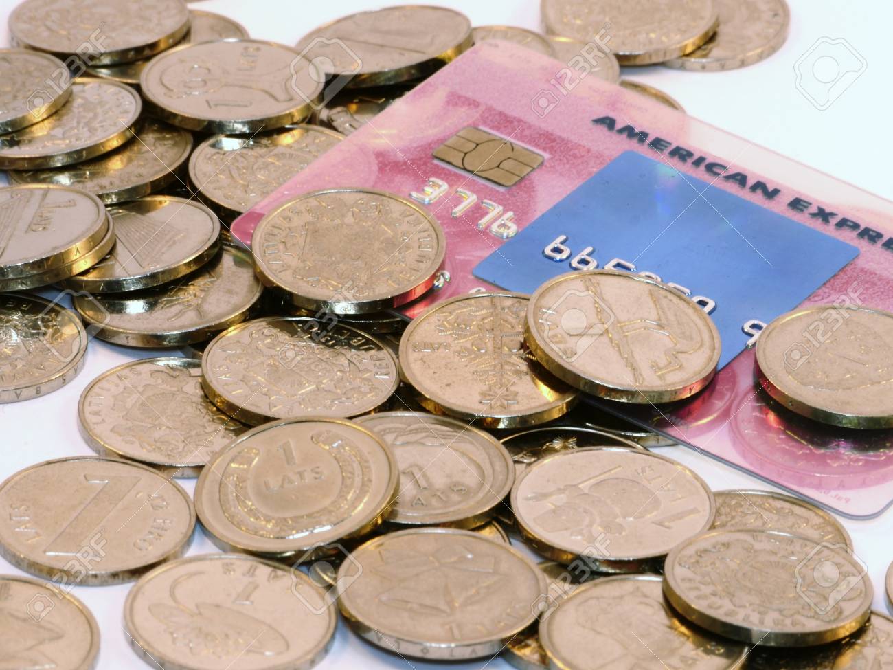 コインとクレジット カード アメリカン エキス プレス マスター カードの束 の写真素材 画像素材 Image